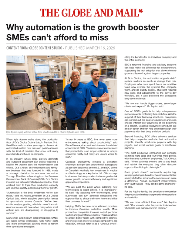 Dr.'s Choice Optical Lab was recently spotlighted in The Globe and Mail as part of a feature on how Canadian businesses are using automation to grow and compete. The article highlights our investment in a fully automated production line — and what that modernization has meant for our team, our clients, and our future as Ontario's premier independent wholesale lens manufacturer. Click below to read the full article.